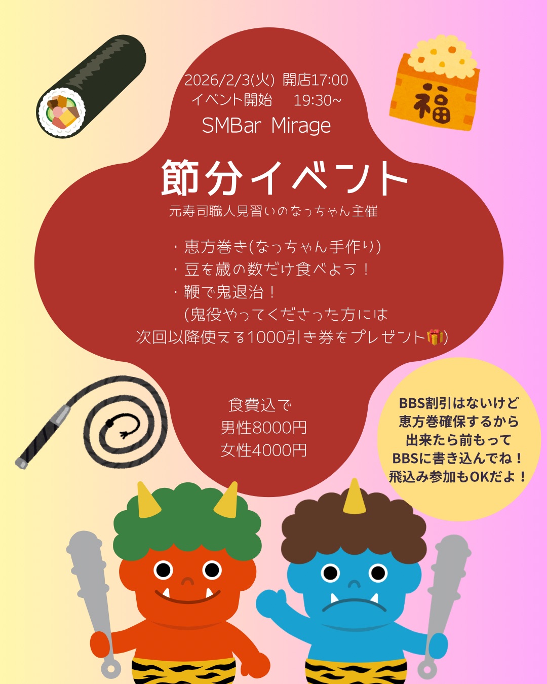 そうそう、ミラージュではSM Barらしく鞭で鬼退治!鬼さんも募集中です!